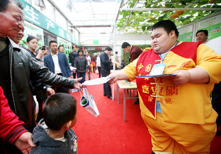 寿光日报讯 (记者 刘丽丽 通讯员 张秀树)4月21日,有“中国一肥”之称的梁用先生亮相菜博会全福元农资展位,他是金正大嘉安磷肥料的形象代言人。据了解,梁用今年已28岁,重量却达到了225公斤。