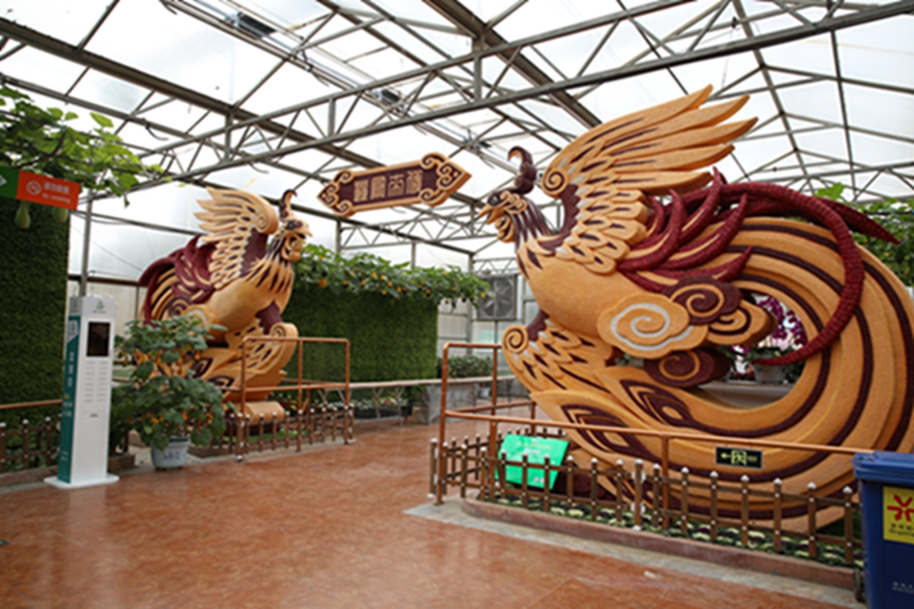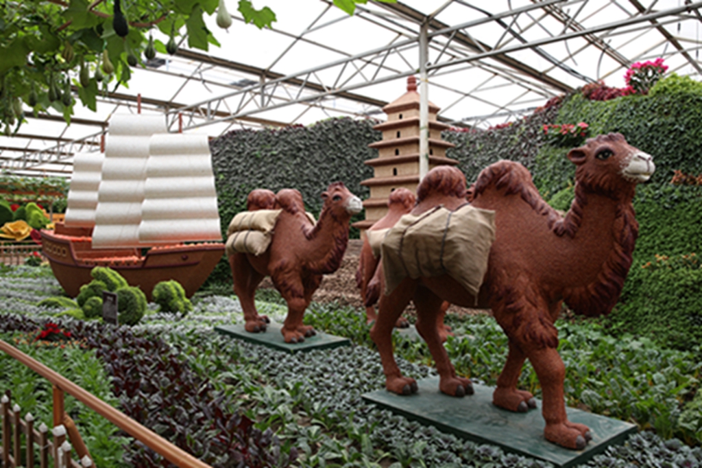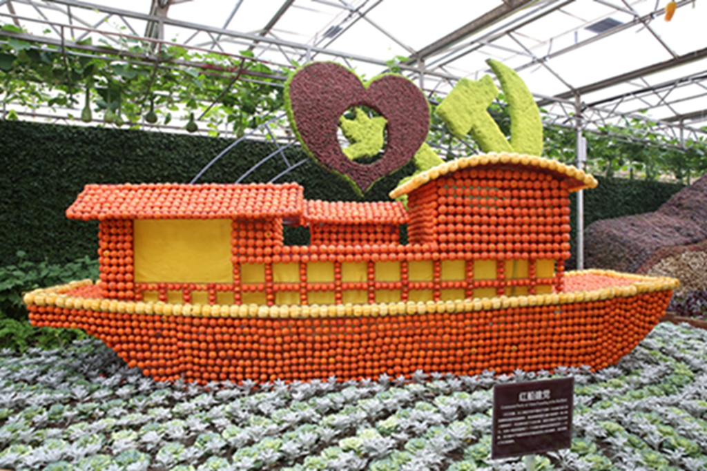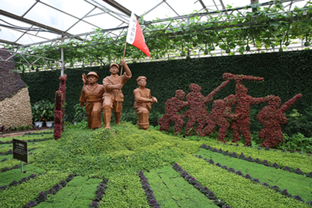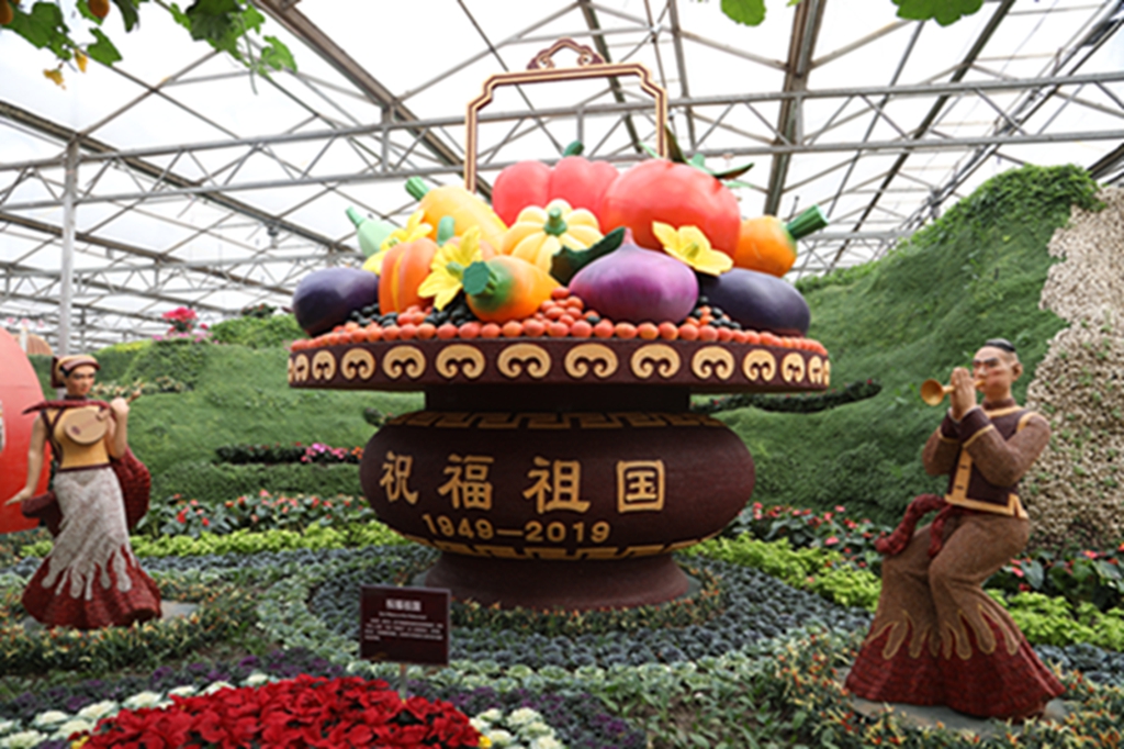 第二十届菜博会八号展馆蔬菜文化艺术景观展示馆,主要展示“伟大复兴”、“创始追梦”、“红色丰碑”、“清风绿韵”等十余个大型蔬菜景观,运用盆栽、挂果、扦插、粘贴、雕刻等表现形式,展现新中国成立70周年辉煌成就和新时代、新精神。