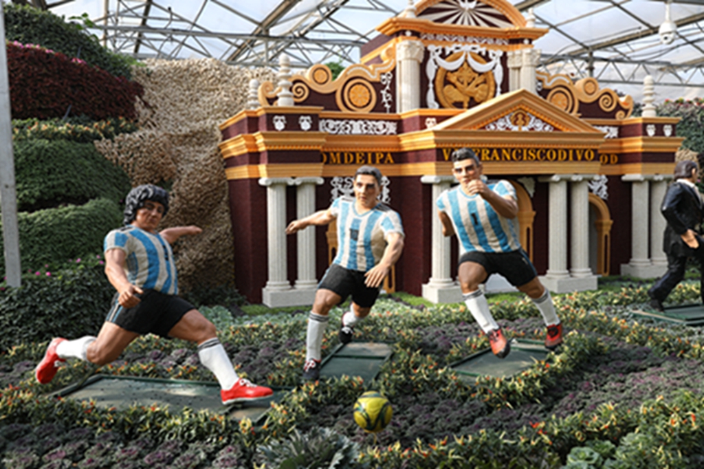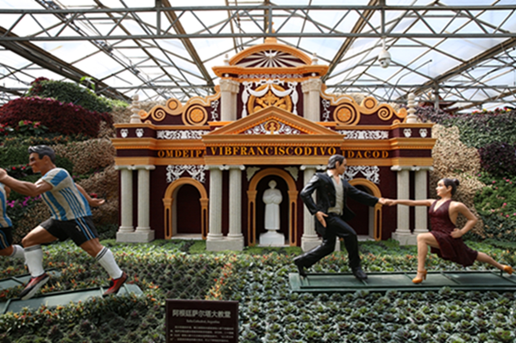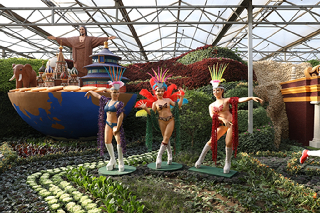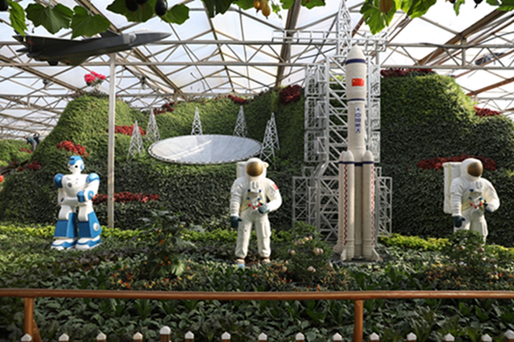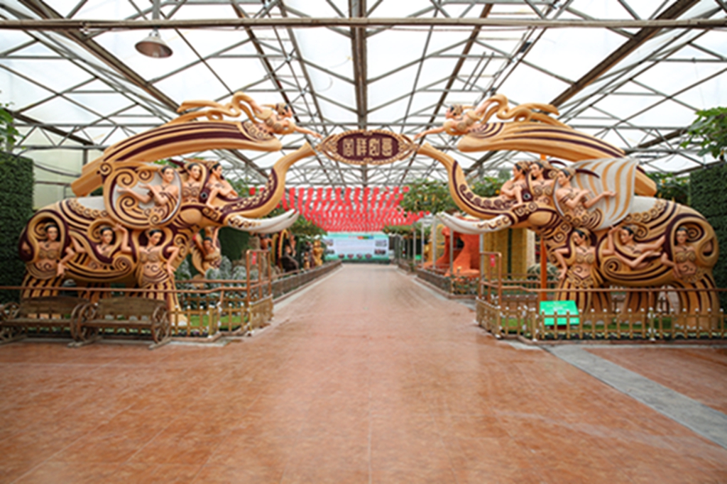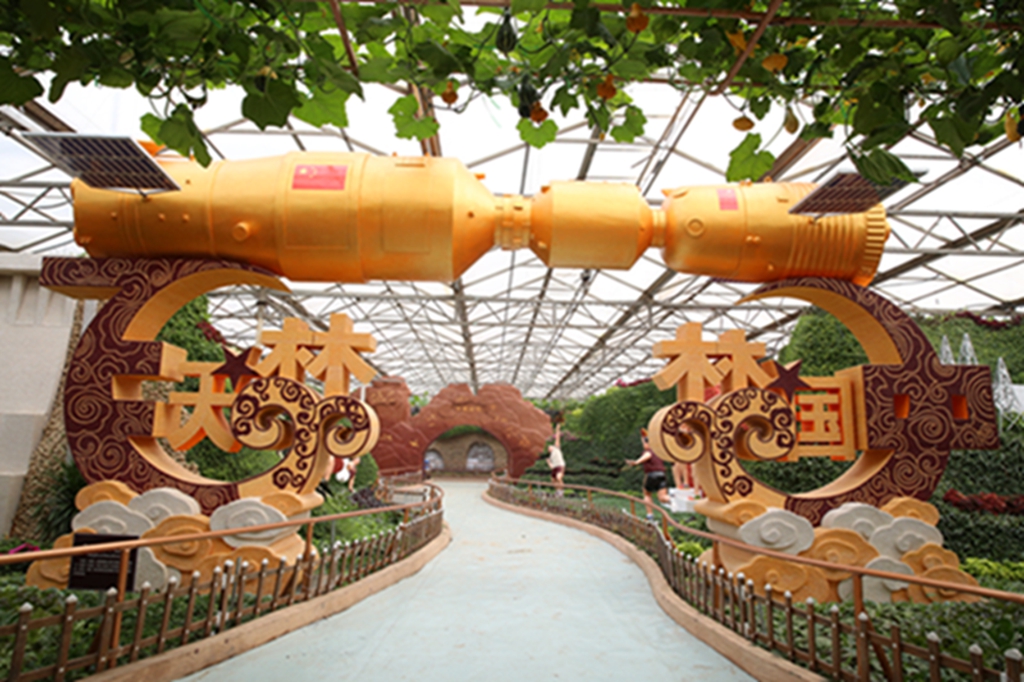 第二十届菜博会八号展馆蔬菜文化艺术景观展示馆,主要展示“伟大复兴”、“创始追梦”、“红色丰碑”、“清风绿韵”等十余个大型蔬菜景观,运用盆栽、挂果、扦插、粘贴、雕刻等表现形式,展现新中国成立70周年辉煌成就和新时代、新精神。